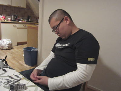 食事会帰りのおのさん。入ってきた途端、強制カツラw