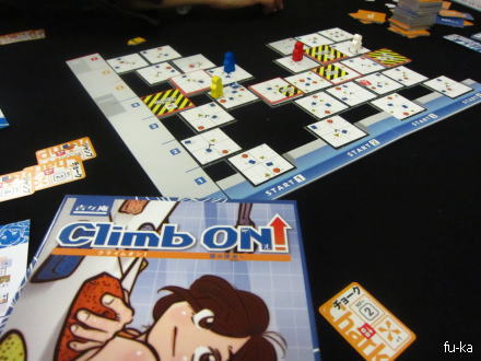 ・クライムオン!(吉々庵)各自がタイルを並べて壁をつくっていく。途中で落下したりするので注意。自然にトド吉と侍、私といたるさんが同じコースという形になり、さらに人の邪魔はしないと!ということで、先頭をいく侍に難易度高いタイルをプレゼントw トド吉も巻き込まれる形。私のコースではいたるさんが進んでいくので、こっちにもプレゼント。そして逆にプレゼントされ自爆w ダイス目がすべてではないし楽しくて良い感じ。邪魔があるので長めに感じて、中盤あたりで単調さを感じるかも。そこまで泥沼化しないのは良い点。