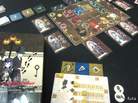 見た目で推理ゲームかと思ったら、中身はまったく違った。ゲームはいたって硬派。自分のチップを置いてアクション選択。これがプレイ順に影響されてくるので、かなり悩ましい。2人が鍵を集めにいっているので後追いは無理と判断して、リソースタイル集め。棚ぼた的に鍵を集めて1人は確保。毎ラウンド入ってくるリソースも便利だし、高得点のタイルを集められたのもよくて勝てた。これはかなり良く出来てるんじゃないかな。ただし3人だったので4人で遊んでみると全然違いそう。