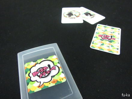 ちょっと気分をかえようということで、まずはトド吉と侍が2人で対戦していたらしい。休憩から戻った私といたるさんで対戦。まんまボーリングで、手裏剣が描かれているカードを投げるだけ。たったこれだけなのに、なぜかやめられない。「見たまんまでしかない」と言いながら、なぜかひゅんひゅんカードを投げてしまう。そしていつの間にかストライクを狙って必死になっている。これがいいところで狙いからはずれる。こうしてやめられなくなっていくので、キリのいいところでやめる。おそろしいゲームw
