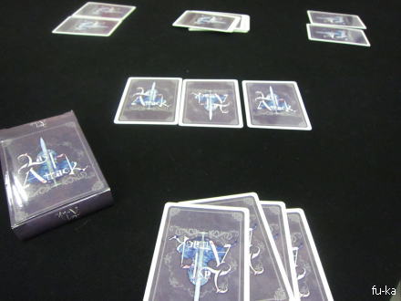 ・Last Attack(雨風色堂)魔王を侍、残り全員で協力して倒す・・・はず。カードを出して規定値を全員でためていくけれど、魔王が目の前にいるから相談も出来ず。魔王が常に好きなカードをめくれるから、どうにもならない感。効果でカードが消えたり。いたるさんが早々に確定して抜け、その後トド吉も抜ける。問題はこの後。私しかいないし仕込んでるカードは全部1とか−1。さらにめくられた効果で並べたカードがすべて捨てに。そこからは1枚出して1枚めくられての形で「これダメじゃない?」ってことで協議終了。1人だけ残されるとゲームにならないw
