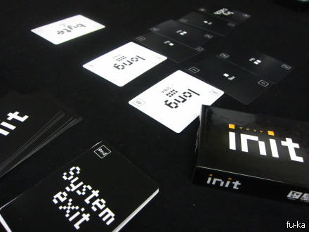 ・init(MRエンターテイメント)説明書に意味がわからないとおもしろくない的なことが書かれていたけれど、それ以前に謎な部分が。バイト数ぴったりになればカードが得点としてもらえて、特殊カードでオーバーしないと取れないとか、そういった感じになっている。ゲームの本質はシンプルなんだけど、こうなったらどうなる?的な疑問も出てきて、何度も説明書を確認したものの不完全燃焼で終了。ルールブック大切。でもまぁ、わからない人にはつまらないと書いてあったので仕方ないのかな。