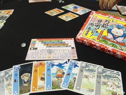 万猫の豊明かり(梟老堂)まずカードのイラストがかわいい!カードを見ているだけで幸福感w カードは春夏秋冬になっていて、出せる季節が決まっていて、数字の大きさ比べ。1位と4位は場に出てるカードを受け取るけれど、2位と3位は自分が出したものを引き取ってくる。酒アイコンは1つ2点だけど3つで泥酔。場のカードを取りにいったつもりが自分で引き取ってきて自爆したり、万カードを出したらカラスに持って行かれたり。イラストの可愛さだけでなく、ゲームもこのサークルの作品の中で一番好み。