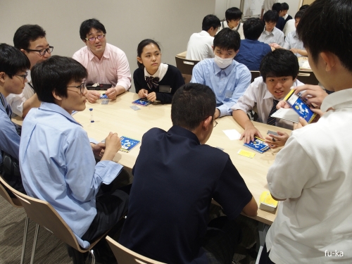 それぞれのテーブルに各校の生徒たちが着席し、自校のボードゲーム環境について発表し合います。